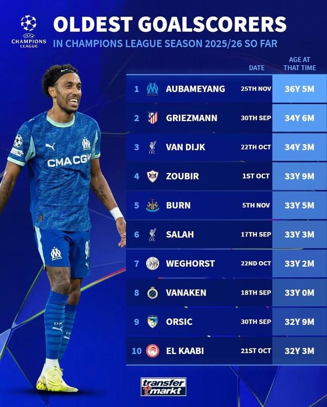 北京时间11月26日,在欧冠联赛阶段第5轮的比赛中,奥巴梅扬完成梅开二度,帮助马赛主场2-1逆转战胜纽卡斯尔联,赛后德转列出本赛季欧冠最年长的10位进球球员,奥巴梅扬以36岁5个月的年纪排名第一,格列兹曼第二,范戴克第三,萨拉赫第六。